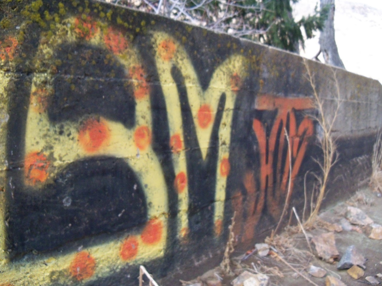 Inside of the drainage ditch, some graffiti (art). Look over the 4ft wall and see the river below.